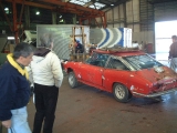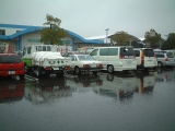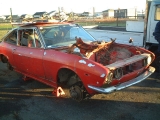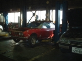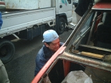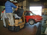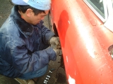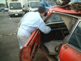 HMの解体作業してみての一番の印象は、やはりHMと量産の違いでした。例えばドアの内張り一つとっても、上部のステンモールの取付け方は量産では内張りと一体になっていてモールはドアに引っ掛けるだけなのですが、 HMは皿ネジ4個で留まっており、この場合ガラスが嵌められているステンサッシを抜かないとモールが取れません。それ以外にもクラッチがリンク式になっていたり、リアのクオーターガラスの取付け部の金具や、トランクリッドのアームなど、etc、etc・・・。 17) 今回解体されるというHMです。まだリフトに載っていました。 18)19)20) そこからフォークリフトを器用に使って裏の駐車場に移されました。 21) 午前中の作業が終わったところ。 22) O西さんがリンク式のクラッチレバーに取り掛かりました。 23) こちらでは薀蓄さんことH口さんがドラムブレーキのシリンダを取り外しています。真剣な表情。 24) うまく外れたようです。 |